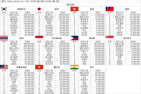 아시아국가별 유튜브뮤비 조회수