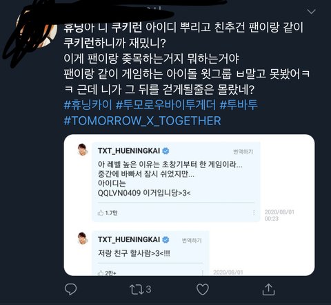 휴닝카이가 쿠키런 아이디 알려줬는데 팬이랑 ㅈ목질한다고 화내서 물어보는 거야