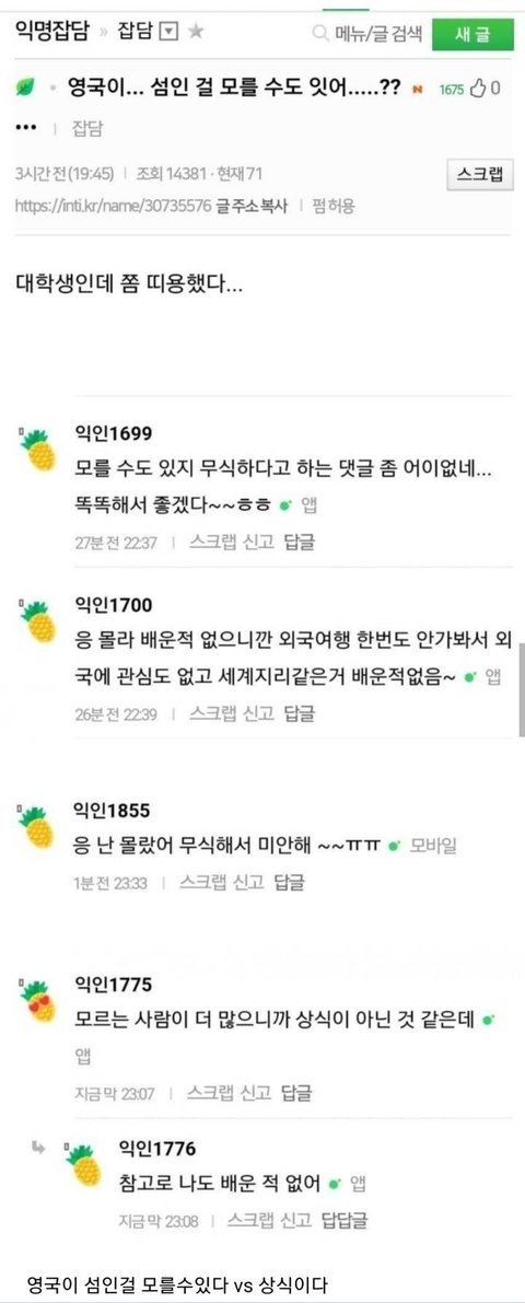 아니 모를 수 있는데,,,, 모를 수도 있는 거 아닌가 니들은 뭐 다 알아? 꼭 알아야 해? 그거 알아서 뭐함? 이런 댓글들 보면 아 저래서 영국이 섬인 것도 모르고 사흘이 3일인 것도 모르는구나 싶음