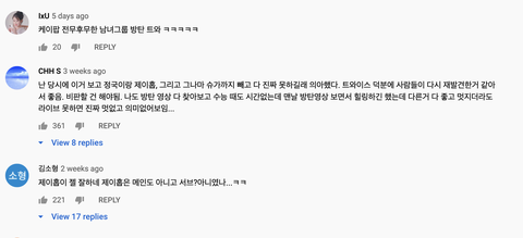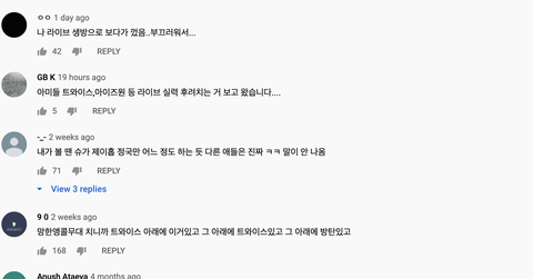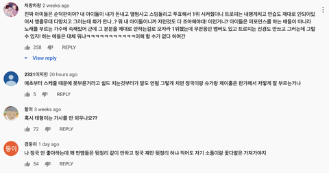 노래를 못한다 = 악플이다, 또 누구 죽일셈이냐, 방탄한테 열폭하네, 응~국위선양 빌보드 느그 본진 망돌(?) -> 가수한테 노래 못한다는게 악플이 아니고, 높은 위치에 있으면 그만큼 열심히 노력해야지 돈도 ㅈㄴ많이 벌텐데. 엑소는 9년차에 보컬트레이닝 받고, 지디는 10년차에 무대 탈진할정도로 열심히 하고, 하이라이트 양요섭은 군휴가 나와서 보컬트레이닝 받는다던데 정국이 자기 입으로 보컬트레이닝 한번도 안받았다고 얘기했고