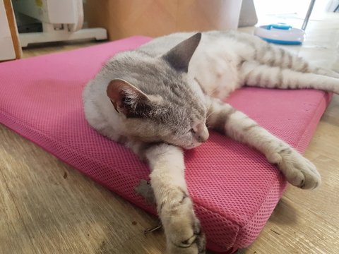 얘도 개냥이가 되어 사무실에서 사촌들과 뛰어놀며 잠도 퍼질러 잡니다..
