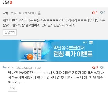 진짜 한심하다..... 굳이 이런 댓글까지 남기는 너 대단해! 나 지디 팬 아님 우리 때 하면 지디가 넘사라 생각 나서 적은 거고 그 일 잘 몰라서 뭐라 언급은 안 하지만 너 있잖아 남 인생 신경 쓸 시간에 니 인생이나 신경 써 베댓 말 대로 어그로 끌리면 삭제할게