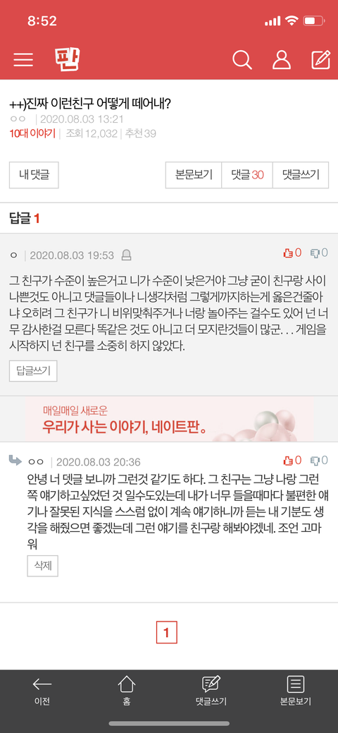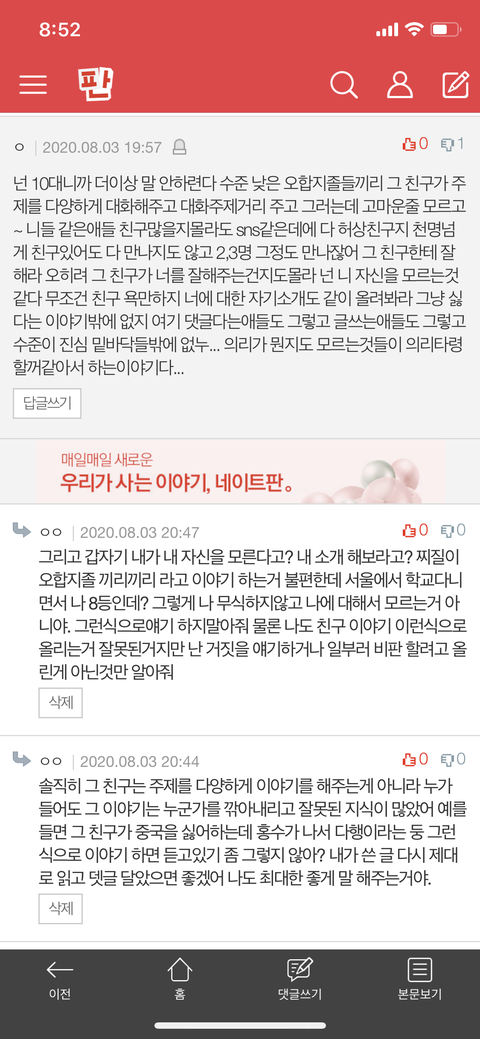 그리고 한명이 계속 내 주변,나,10대를 깎아내리는 댓글 계속 쓰는데 맞지않는 이야기니까 쓰지 말아줘
