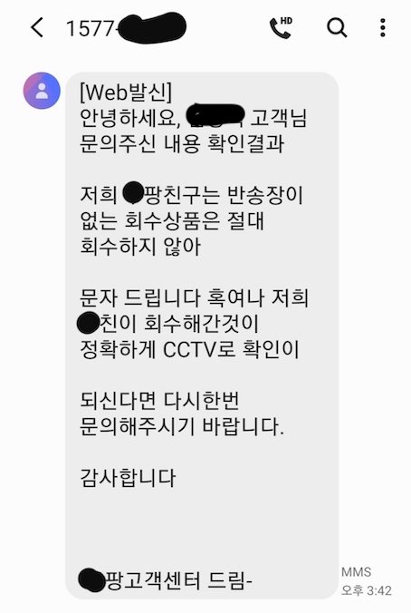 오늘 오전 8월 4일 오전 11시 40분 X팡에서 다시 전화가 왔습니다.X팡캠프에 알아보니 그 X팡 택배원이 자기가 가져가지 않았다고 했다고 합니다.나 참.. CCTV도 제가본거지 자기들이 본게 아니라면서 확인이 필요하다고 합니다.저는 위에 사진처럼 CCTV확인후에 연락달라해서 확인하고 연락했는데 말이죠.계속해서 더 알아본다고 또 다시 내일까지 기다리라고만 하고있습니다.