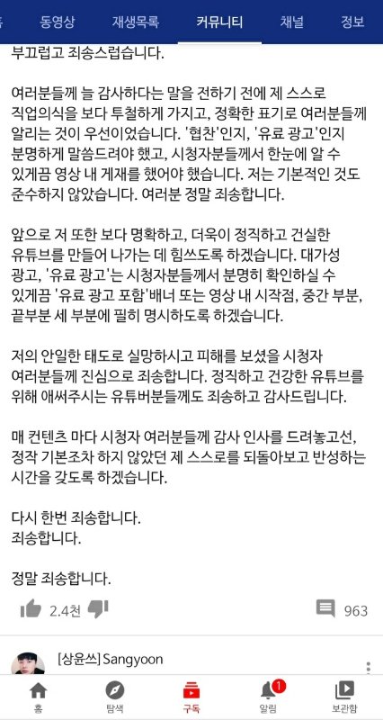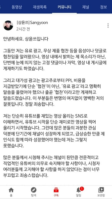 ❗104만 유튜버 상윤쓰도 유로 광고 미기재 사과문 뜸❗