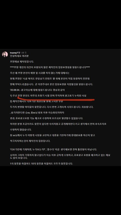 근데 쯔양은 ㅁㅂㅎ나 ㄴㄹ같은 애들이랑은 결이 다르지 않음?? 얜 초창기에 몰라서 그랬고 잘못된 거 안 이후로는 계속 꾸준히 표시해왔다며