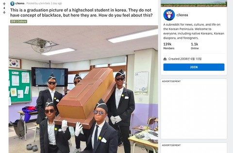 이런 분장이 인종차별적인건 영미권 문화 아니야? 우리가 왜 쟤네 문화까지 신경써서 행동해야됨? 쟤네 나라 가서 한것도 아니고 공식적인 영화나 화보도 아니잖아.