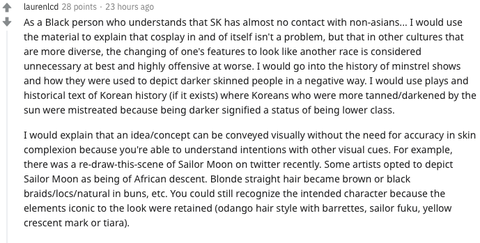 요약: 흑인 코스프레한 것 자체는 문제되지는 않지만, 다른 문화권에서는 인종의 특징을 표현하는 것이 불필요하고 심지어는 매우 불쾌하게 할 수 있다. 흑인들은 세일러문 코스프레를 할때 옷이나 브로치 정도만 표현한다. 그래도 충분히 알아볼 수 있다.