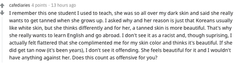 요약:나는 예전에 어두운 피부를 아름답다고 생각해 원하는 소녀를 가르친 적이 있다. 그녀는 태닝을 했다. 너네는 이게 인종차별적이라고 생각하니?