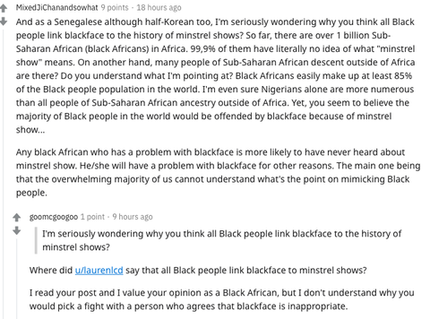 요약: 나는 한국인과 세네갈(아프리카 국가) 혼혈으로서 왜 모든 흑인들이 흑인 분장을 하는 것을 민스트렐 쇼와 연결한다고 생각하는지 모르겠다. 사하라 이남 아프리카 흑인들이 10억명이 넘는데 이중 99.9%는 이것을 모르고 블랙페이스를 기분나빠하지 않는다. 이 아프리카 흑인들이 전세계 흑인중 85%를 차지한다. 우리 흑인들 중 대다수는 블랙페이스의 의미를 잘 모른다는 것이다.(영미권과 아프리카가 아닌 곳에 사는 흑인을 제외하고)