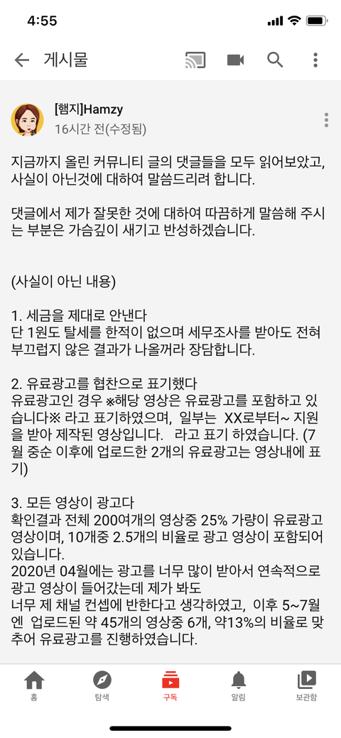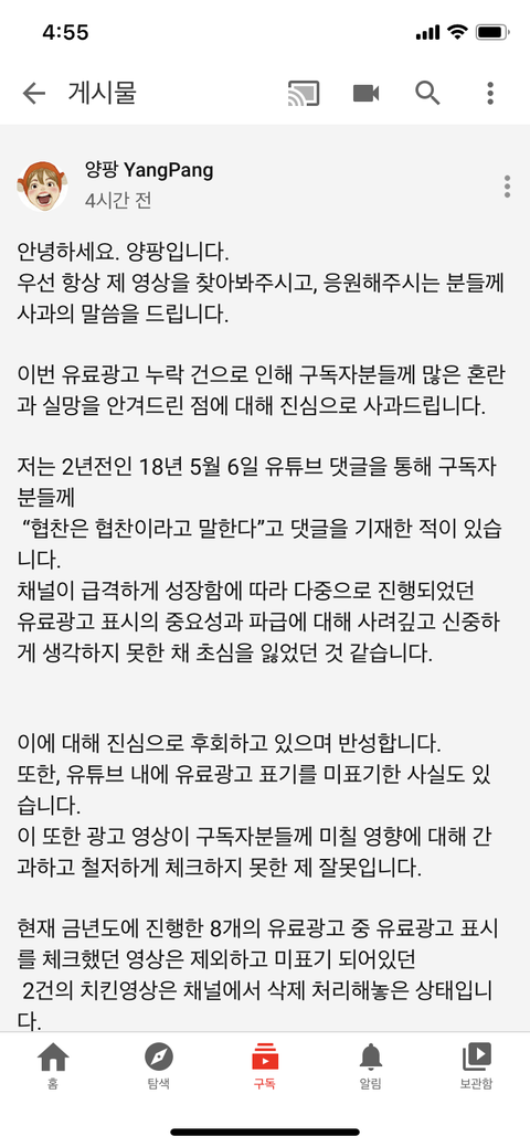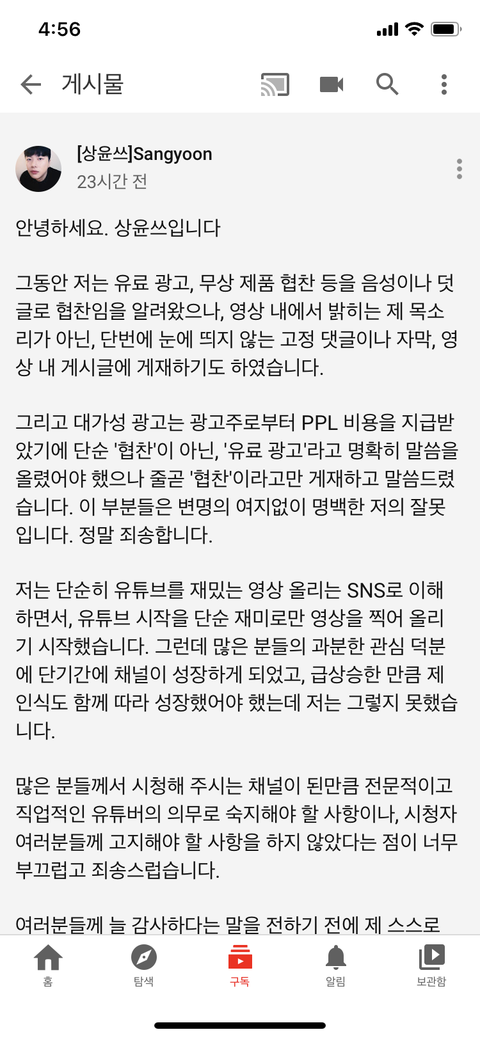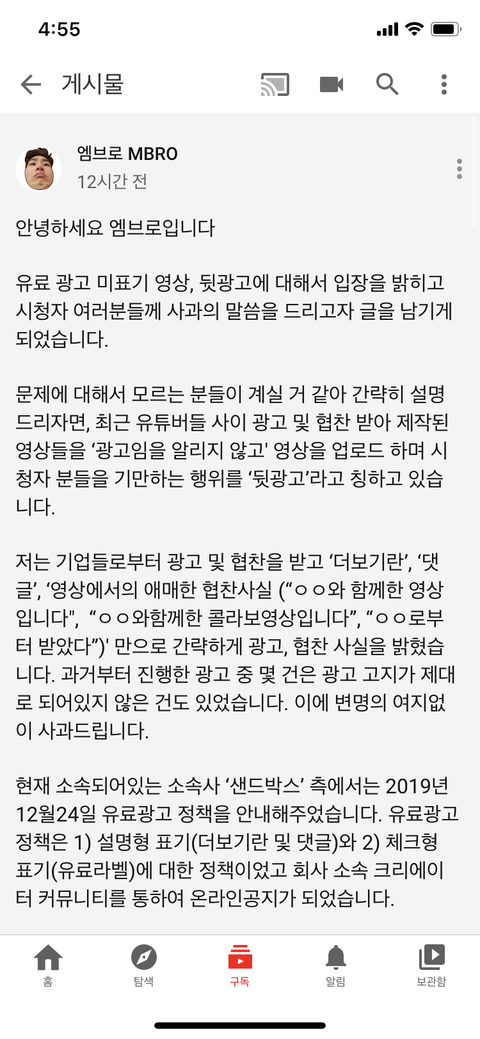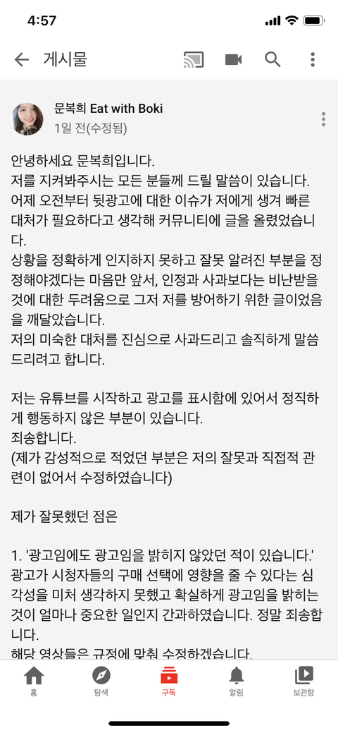 내가 보는 먹방 유튜버들 다 뒷광고 사과문 올림