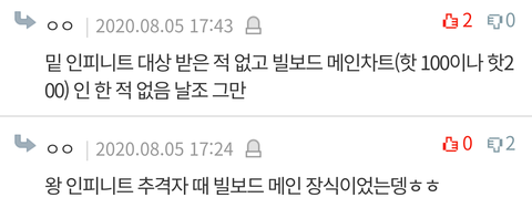 인슾 종특이 타가수들이 대상 받을때마다 패는거 아니었냐?ㅋㅋㅋㅋㅋ 쟤네 타가수들이 대상 받을때마다 우리 인피니트는 빌보드 아이돌인데 대상따위가 뭐 대단함? ㅇㅈㄹ했던거 다 기억나네 ㅋㅋㅋ 그 글 캡처한 것도 있는데 올려버려??ㅋㅋㅋㅋㅋㅋ 그 글 박제한거 지금도 내 갤러리에 있는데 ㅎ