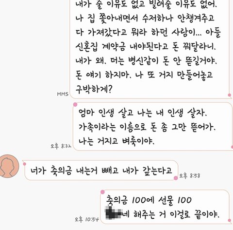이왕 남 된 거 아버지께는 800만원 남동생한테는 축의금 준 거 달라고 계좌보냈습니다. 남일수록 돈 관계 철저히 해야 하니까요. 아마 이제 연락 없겠죠... 돈에 환장한 인간들이라서.