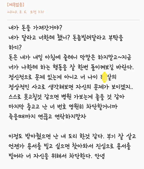 그리고 새벽에 동생이 돈 돌려주기 직전에 보낸 메세지입니다. 저랑 2살 차이나구요 열받으면 이런식으로 누나 호칭은 커녕 쉽게 손찌검하고 욕하던 놈인데 저더러 정신적으로 문제 있으니 병원에 가봐라. 그리고 용서를 빌고 싶으면 찾아와서 빌라고 하네요.