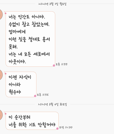 그리고 바로 아버지가 문자로 이제부터 너는 내 딸도 아니고 내 모든 세포에서 너 지울거라고 문자 보냈더군요.