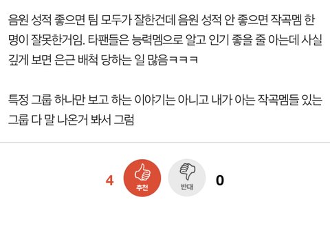 뭔가.. 자신들 맘에 들지 않는 곡이 나오면 항상 (본인들의 최고가 아닌) 작곡멤이 질타받는게 맘아파.. 컴백의 컨셉을 혼자 정하는 것도 아니고 멤버들 그리고 회사들의 의견을 섞어 나온 앨범일텐데..ㅠ 게다가 이 글처럼 잘되면 다 팀 전체의 노력 잘 안되면 작곡멤의 능력의 문제... 이런 반응이 난 조금 속상해..!