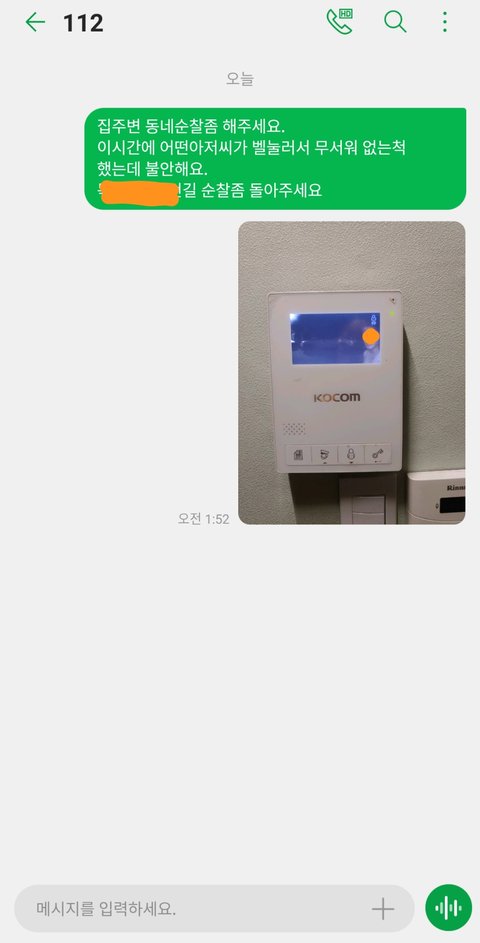경찰에 수상한 사람이 있다고 순찰좀 돌아달라고 문자로 신고를 했어.