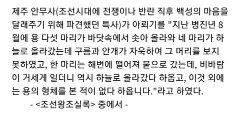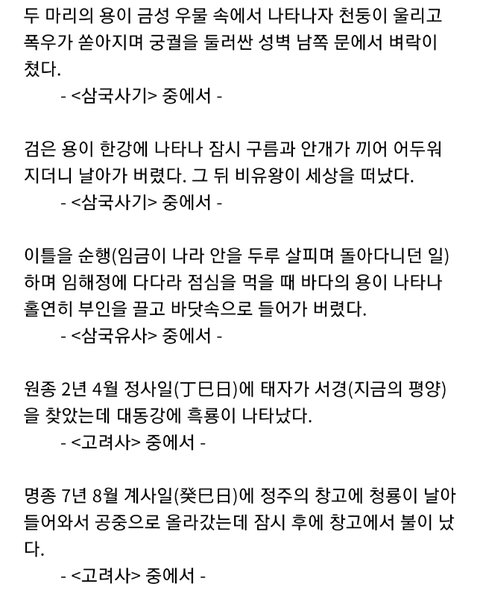 나는 이런거 관련해서 잘 아는 편이 아니라 한 번 찾아봤는데 밑에 글들이 용을 봤다는 옛 기록들이래 용이 상상 속에서 만들어진 동물이라는데 저런 글 보니까 그럼 저분들이 본건 뭘까 이생각이 든다...