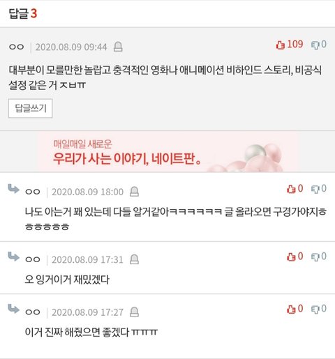 이번엔 다들 많이 원하는 주제인 영화&애니메이션&만화&노래 등등 비하인드 스토리(뒷이야기)로 가져와봤어!