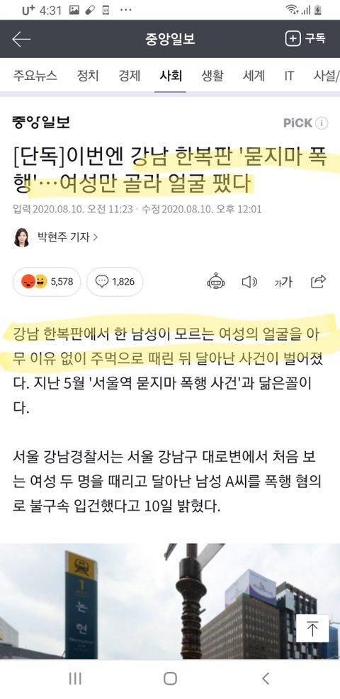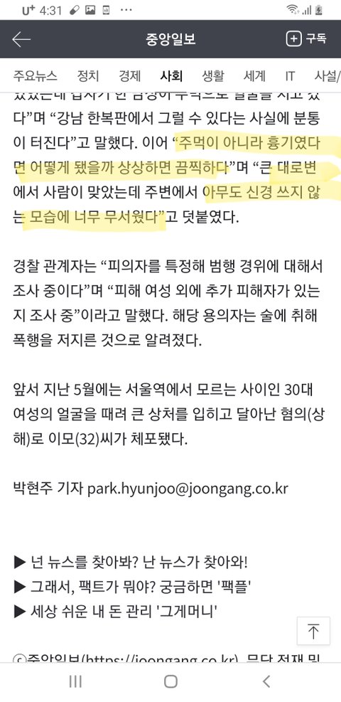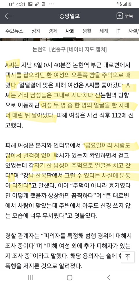 강남 한복판에서 여성만 골라 얼굴 폭행