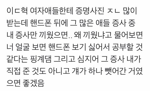 아니 난 머리가 어떻게 됐나봐...난 동혁이한테 증명사진을 줬지만 지갑에 끼워지지 못한 수많은 여자애들 중 한명에 이입해서 너무 슬퍼......난 선심쓴다는 듯이 일부러 하나 남겨뒀던 증명사진 줘놓고 혼자서 몰래 엄청 좋아하다가 나중에 저 본문글의 사실을 알고 집가서 울거같아.....앓다죽을 이해찬....