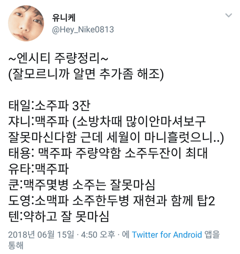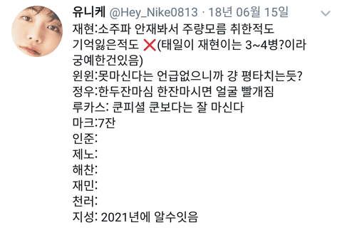 제노는 주량은 안재봤고 소주, 맥주 다 마시지만 소맥 마는 건 싫대