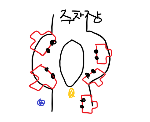 그래서 그 주차장 입구 한가운데 차 방해 안되게 약간 비켜서서 얘기했습니다(노란곳)