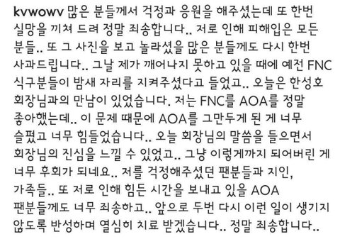 제대로 치료받고 더이상의 자살암시나 자해등의 행동 없이 깔끔하게 마무리 짓길바람. FNC도, AOA도 좋았다고 말하지만 결과적으로 본인 인스타글들로 인해 회사며 AOA며 막대한 피해 입은게 사실이고, 극단적인 행동을 하는통에 다른 멤버들 끔찍한 악플에 시달리면서도 그 누구도 본인들 입장 말도 못하는 상황 만들었잖아. 회사며 다른 멤버들이며 아무 방어도 못하고 끔찍한 악플세례 받을 상황 초래한거, 사건과는 별개의 사생활 폭로해서 피해입힌거, 대중들 끌어들인만큼 본인이 한 말에 대한 객관적인 사실 여부 등등 제대로된 치료 받고 나서 성인이면 성인답게 이부분에 대한 책임 확실히 지길 바람.