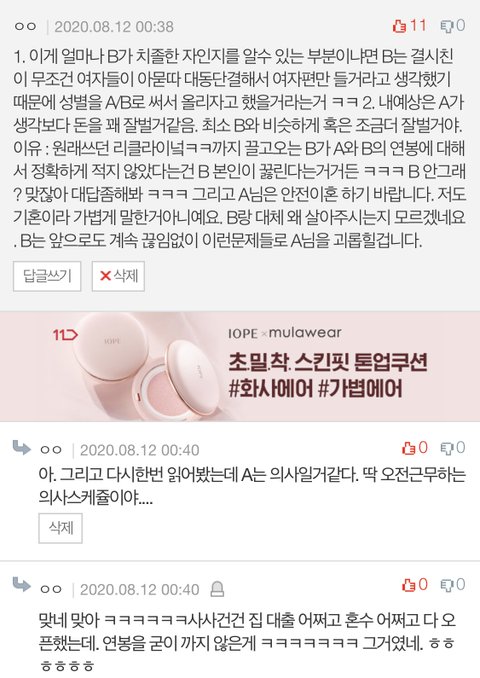 추가 글이 저렇게 구질구질 해진 이유는 본문을 올리고 댓글들이 남편을 욕하는 댓글이 많아지니 남편이 먼저 올리자고 했습니다. 남편은 추가 글에 집을 B가 해왔다고 하면