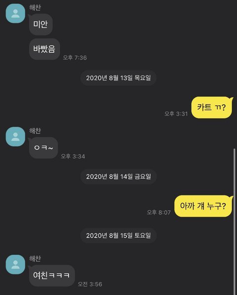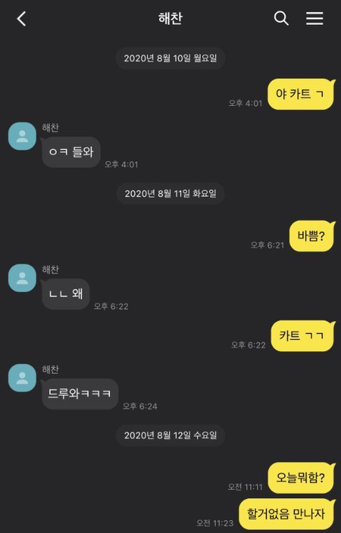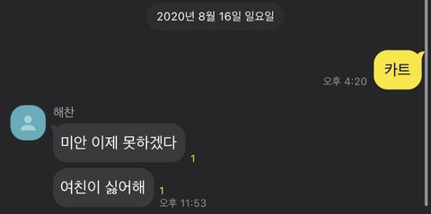 카트면 바로 대답하는데 만나자는 톡에 안읽씹했다가 몇시간 뒤에 톡 오는거...... 나만 진심이었지 동혁아
