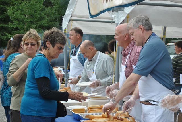 자원 봉사자들이 핫도그와 햄버거를 나누어 주고 있네요.