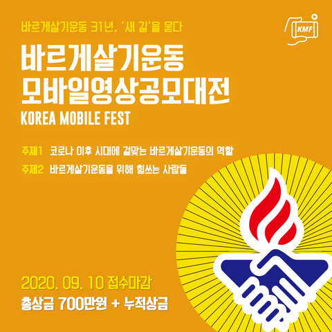 바르게살기운동중앙협의회는 대한민국 대표 누적상금 기반의 온라인•모바일 영상제 코리아 모바일 페스트(KMF)와 연계하여 ‘바르게살기운동 모바일 영상공모대전’을 개최합니다!