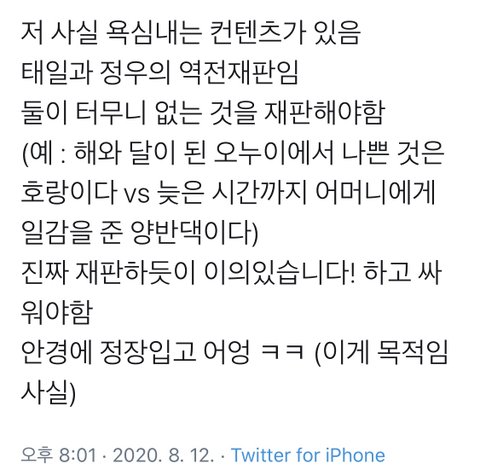 싸우다가 꼭 해와 달로 드립 하나 쳐야 됨 ㅋㅋㅋㅋㅋ 문태일이 슬쩍 드립하면 김정우 승부욕 붙어서 맞받아치고 끝에서 정재현 중얼거리고 또 그 옆에서 이마크랑 이해찬 낄낄댐... 아 벌써 한 편 본 것 같다 ^^