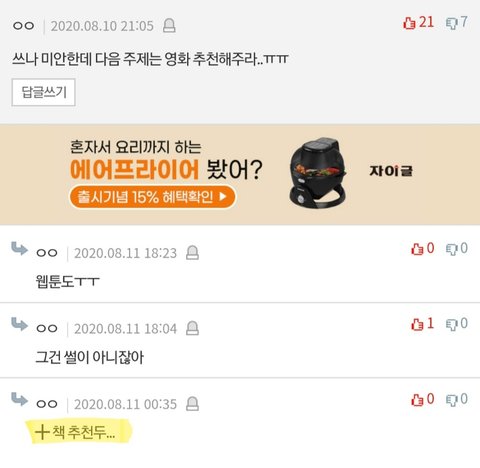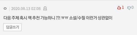 오늘은 내가 하고싶었던 주제기도하고 다른 몇몇 판녀들도 책 추천 원하는 댓글이 있더라고! 그래서 가져와봤어ㅎㅎ 다들 댓글로 책 추천 많이 해주라❤ 어떤 장르든 상관없어!! 아 그리고 저 댓글사진에 적힌 영화나 웹툰 추천글도 다음에 꼭 할게! 지금 이때까지 추천받은 주제가 20개정도 밀려서ㅠㅠ 나 댓글 진짜 거의 다 보고있어!! 암튼 혹시 보고싶은 주제 있으면 댓글로 적어줘! ฅ^._.^ฅ