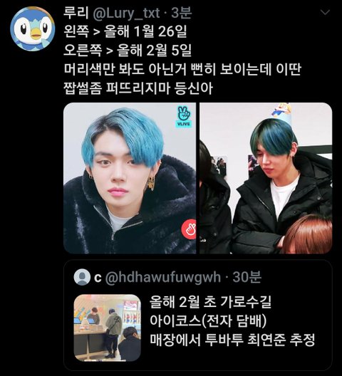 엔터에는 늘 무슨썰만뜨면 아 내본진인데진짜면 실망이네 어쩌고 웅앵웅 개많은데ㅋ 파머그렇게오래했는데 구별못하냐 사진속누군지모르지만 머리색보자마자 군청색인데 연준이가 가졌었던 머리색이 아니자나 툽팬 오래했으면 이정돈 구별할줄아는데 엔터에서 씨부리는몇명뭐임ㅋㅋ 그런글 우다다 휩쓸려서 올라올때마다 대체 몇살먹은 얼마나어리길래 똥인지된장인지 매번 구분못함?