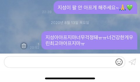 아가 다리 부상이라는 말 듣고 정말 마음이 찢어질 것 같아서 방금 남은거 하나 보내고 왔어... 30자 제한 때문에 띄어쓰기 없이 후다닥 저렇게 보냈다..... 괜찮은거 맞겠지....? 아아 마음 아파 진짜 ㅠㅠㅠㅠ 어젠 팔 아프지말라고 했는데 오늘은 다리라뇨 ㅠㅠㅠ 아프지마 지송아...
