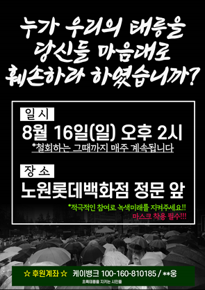 또한, 노원 구민들은 매주 일요일 2시 롯데백화점 앞에서 우리나라 자연을 보호하기 위한 집회를 열고있습니다. 많은 관심가져주세요.