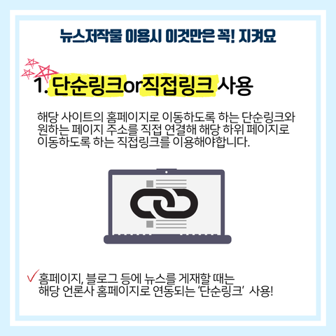 직접링크도 경우에 따라 저작권이 침해될 가능성이 있는데요! 뉴스를 게재할 때는 직접링크보다 ‘단순링크’를 사용하는 습관을 길러봐요☺️