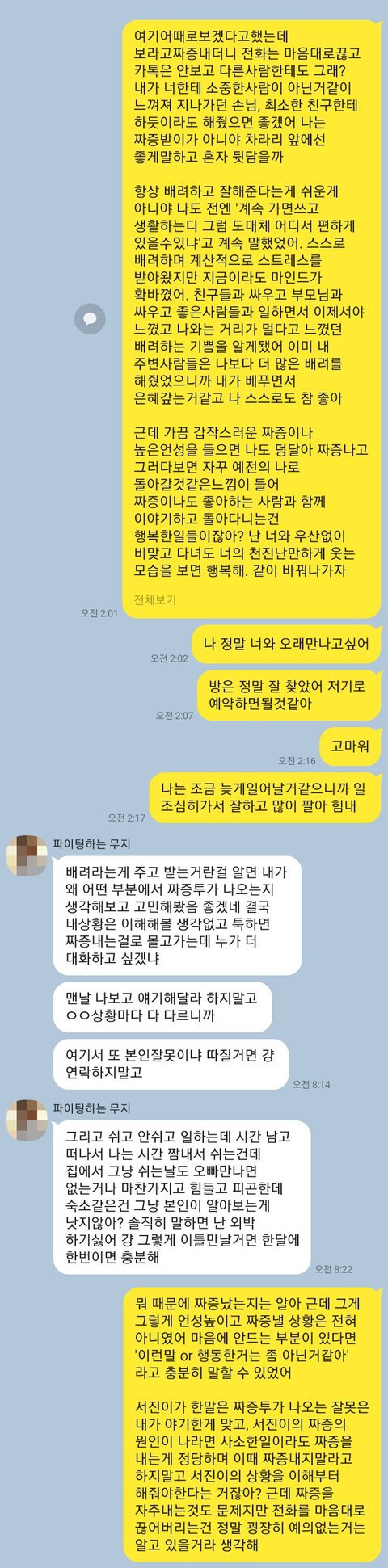 그래서 저는 어차피 혼자 찾아도 소용없으니 "내가 여기어때로 볼테니 야놀자로 봐봐 같이찾자"라고 했습니다. 전철역 한곳이 떨어진곳을 제시하길래 "좋은곳인것 같다 하지만 거리가 있는데 괜찮겠냐? 비가오니까 부담될수 있다. 짜증안낼거면 좋다 난 상관없다."라고 했습니다.