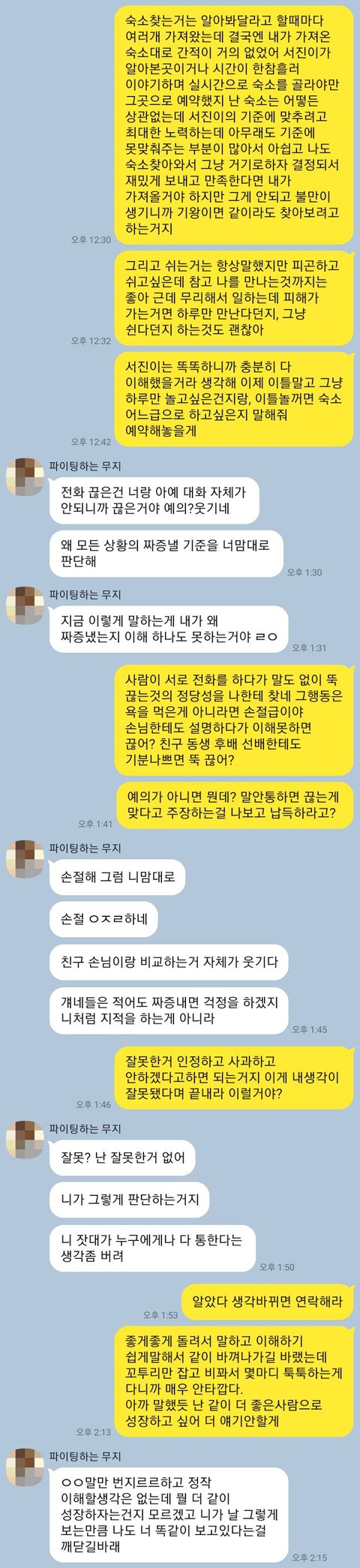 저말을 듣고, "여기어때로 같이 찾아보라고" 하면서 언성을 높이며 짜증을 냈어요. 여기서 저도 못참고 "여기어때로 찾고있다고 처음에 말했잖아" 라고했더니 아이씨 하면서 뚝 끊더라고요?