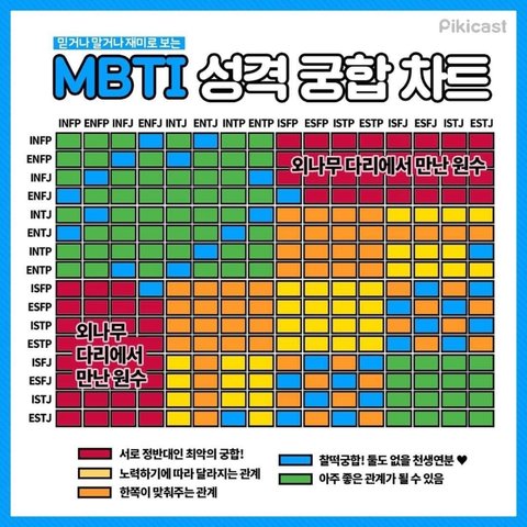 난 isfp고 내 10년지기 절친은 enfj거든??? 찰떡궁합 천생연분이더라ㅋㅋㄱㅋㄱㅋ 얘가 젤편하고 잘맞는 친군데 ㅋㅋㄱㅋㅋ 뭔가 신기하다