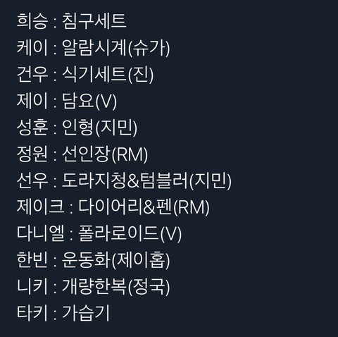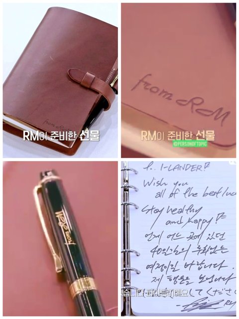 알엠이 준비한 가죽커버 다이어리, 만년필 둘다 from RM이라고 각인해서 준비해옴ㅎㅎ 그리고 어느나라 연생이 가져갈지 모르니까 본인이 아는한에서 한국어,영어,일본어로 편지써옴ㅠㅠ 피피엘 타임일줄 알았더니 일곱이 각자 생각해서 준비해온거 좀 감동이었어