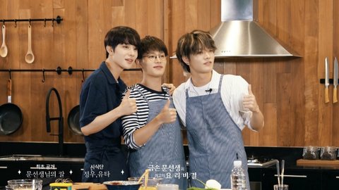 문군의 요리강의임 매 화마다 MC랑 조수가 달라지는데 1편은 정우가 MC 유타가 조수, 2편은 재현이가 조수 마크가 MC였음 탤스팸동과 탤글탤글 파스타가 나온..