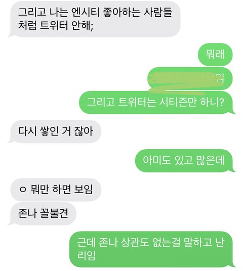 언니랑 한 대환데 개빡쳐 나 원래 시티즌 아니였고 우리언니 시티즌 싫어했음 워낙 병크도 많고 트위터깡패들이라고 싫어했음 근데 내가 이번에 시즈니가 된거야 그래서 숨기고 다녔는데 들켰거든 언니가 알고 화내고 가끔씩 나한테 엔시티는 잘생긴애 없는데 왜 좋아함?이러고 그리고 나 올팬기질이라 병크가 있어도 웬만하면 다 안고 가거든 그래서 욕하면 나혼자 빡쳐서 언니랑 싸우고;;;내 앞에서 내가 좋아하는 아이돌 욕한게 한 두번이 아님 ㅂㅌ좋아할때도 못생겼는데 이러고..언니 이상해 개빡쳐....