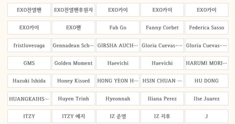 12장밖에 안 올라가지네 강다니엘도 이름 진짜 오지게 많던데... 사진에 다 캡쳐 못했지만 엑소 엔시티 방탄 강다니엘 이렇게 많이 보이더라 다른 아이돌들도 보이고! 아이돌 선한영향 bb