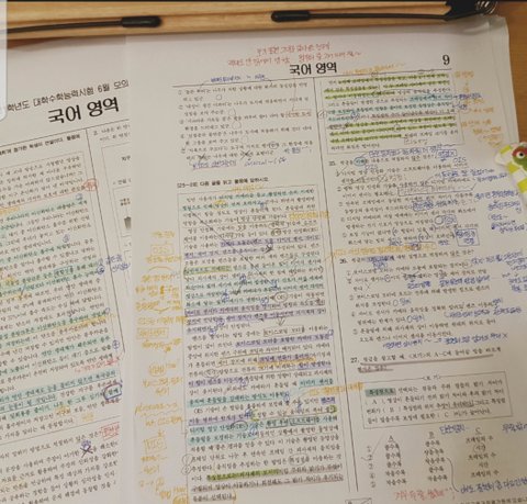 2)형광펜은 학교 선배가 선지의 근거가 되는 문장을 지문에서 밑줄그어보라길래 따라한거임문제마다 형광펜 색 다름. 지문 어디에 걸쳐 한 문제가 나오는지 파악할 수 있고, 지문 전반에서 다 문제가 나오네~선지는 하난데 다른 두 개 문단에서 내용을 끌어왔네 등등 생각함사진 맨밑에 '(지문에서)두줄밖에 안썼네' 써둔 게 그 얘기임ㅎ.. 회색형광펜이 27번 문제거든눈을 빨리 굴려야겠다는 경각심을 얻긴 하지만 고3쯤 되면 시간도 없는데 모든 지문에 다 할 필요 있나 싶고..? 그냥 시험지 예뻐져서 기분 좋아짐 ㅎㅎ