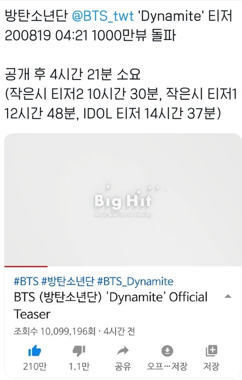 그리고 방탄 티저 공개 후 빅히트 유튜브 공계 구독자수 20만명 늘음ㅋㅋㅋㅋㅋㅋ 유입 미친 수준