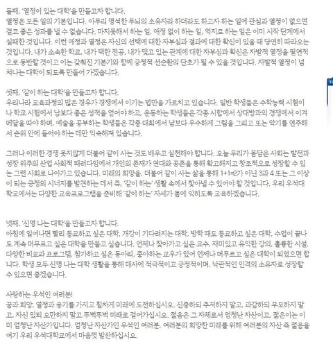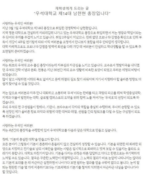 “앞으로 여러분과 자주 만나 대화하고 소통하며” “같이 하는 대학” 이라고 재학생들에게 드리는 글을 올리셨는데... 참 저희 의견들어준답시고 네이버 플랫폼으로 비대면강의를 원하는 학생들의 의견이 압도적으로 많았는데 해주겠다...?는 희망고문과 총장과 함께하는 간담회에서도 여러 번 비대면강의를 추진한 총학생회 입장도 듣는 둥 아닌 둥 하고 결국엔 누구 눈치를 보며 총장을 하시는 겁니까? 학생이 있기에 학교가 있고 총학생회가 있고 총장님이 계시는 건데 이번엔 빠른 시일 내에 부디 대면+비대면이라고 두루뭉술한 표현말고 확실하게 대면하겠다 비대면하겠다를 결정해주십시오. 1학기에서는 코로나가 모두가 처음 겪는 것이고 어쩔 수 없다고 생각합니다. 하지만 이번엔 확산-줄어듬-확산의 구조로 가고 있는 추세인데, 대면 진짜 할 겁니까? 왜 하려고 하는 겁니까?