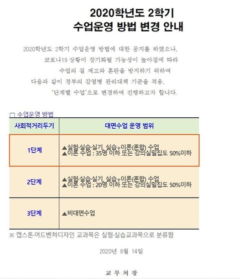 지금 우석대학교는 어떻게 조치하고 있는지 알아보자. 현재 사회적 거리두기 1단계에서 2단계가 되어, 전면 비대면학교는대전대학교다. 중앙대학교는 2주 비대면으로, 연세대학교는 10월까지 온라인강의를 결정했다.
