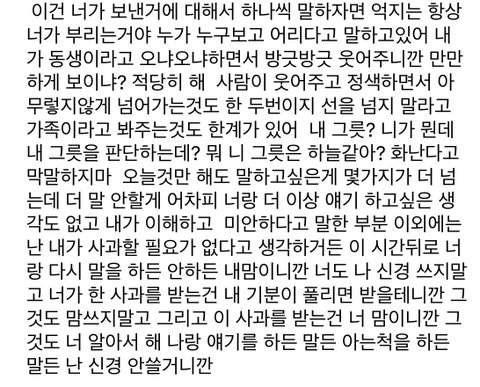 + 부모님한테 혼나고 방에 올라와서 내가 언니한테 언니 그릇이 그 정도밖에 안되는거야? 내가 그냥 연동 풀자고 한 게 그렇게 싫었어? 그냥 언니가 거짓말 한거에 사과해주면 좋겠어."라고 보내고 얼마 안되서 카톡 왔어.(이모한테도 언니가 거짓말한 거 사과한다니까 받고 이해해라고 와서 다 미안해져있었어.)